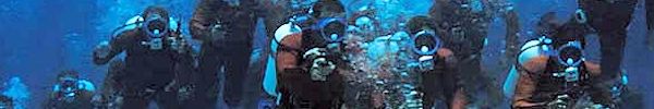 with black and orange-clad scuba divers battling each other with